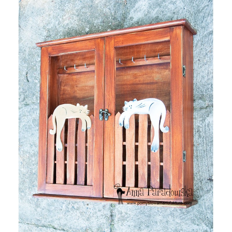 Szafka na klucze z kotami (do powieszenia na ścianie). Unikalny rozmiar XXL czyli 48 x 40 x 10 cm. W środku 19 wieszaczków na klucze. Drewniana, ręcznie wykonana i pomalowana farbami akrylowymi, zabezpieczona ekologicznym lakierem półmatowym (bardzo delikatny połysk). Kolor jasny orzech, koty: szary i czarny.