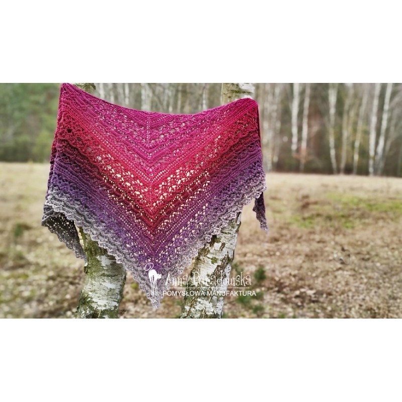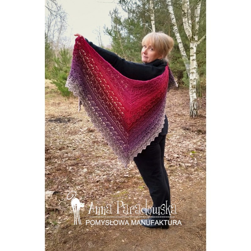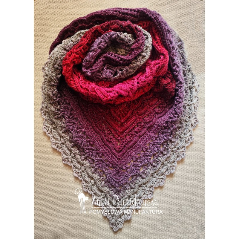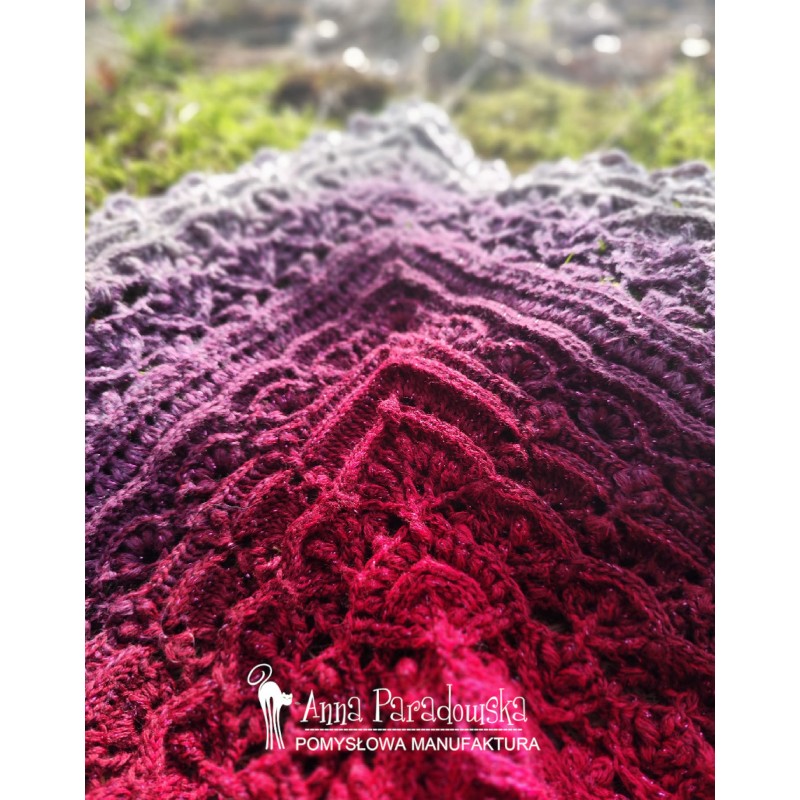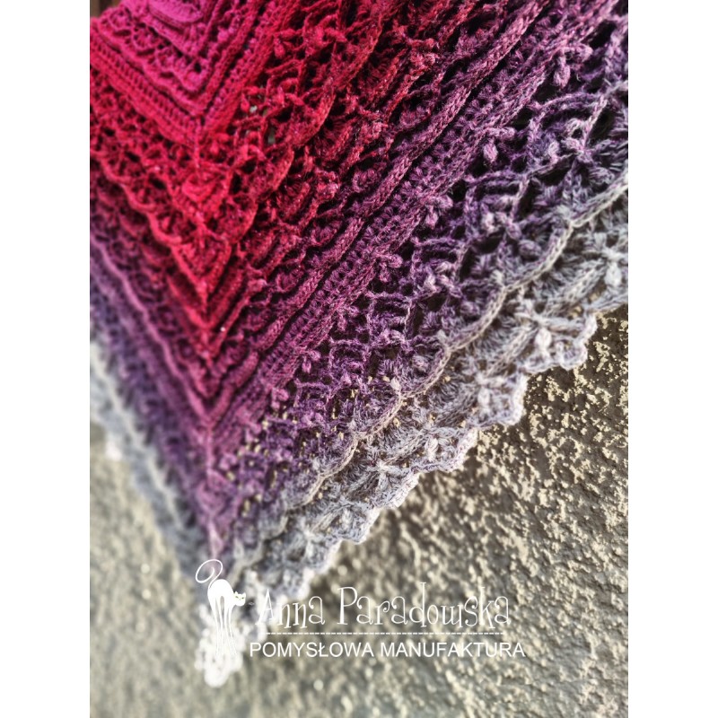 Chusta wykonana na szydełku wg wzoru FIRLETKA Pomysłowa Manufaktura. Piękna kolorystyka: Safari/cappuccino/blady fiolet melanż/burak/bordo/rubin/fuksja z dodatkiem delikatnej nitki lurex w kolorze jeżyny. Motek merino/akryl (50/50), bardzo mięciutka, przyjemna w dotyku. Wym. 200 x 90 cm. Do otulenia Twoich ramion lub jako oryginalny prezent. Potrzebujesz w innym kolorze? Napisz do mnie :)