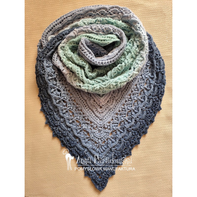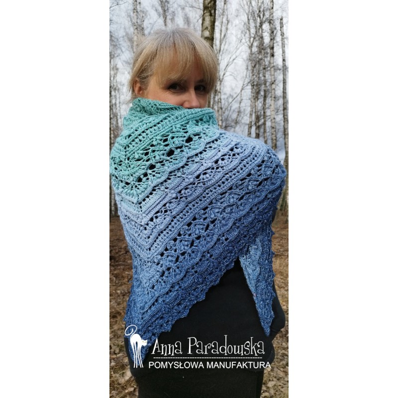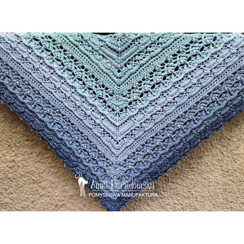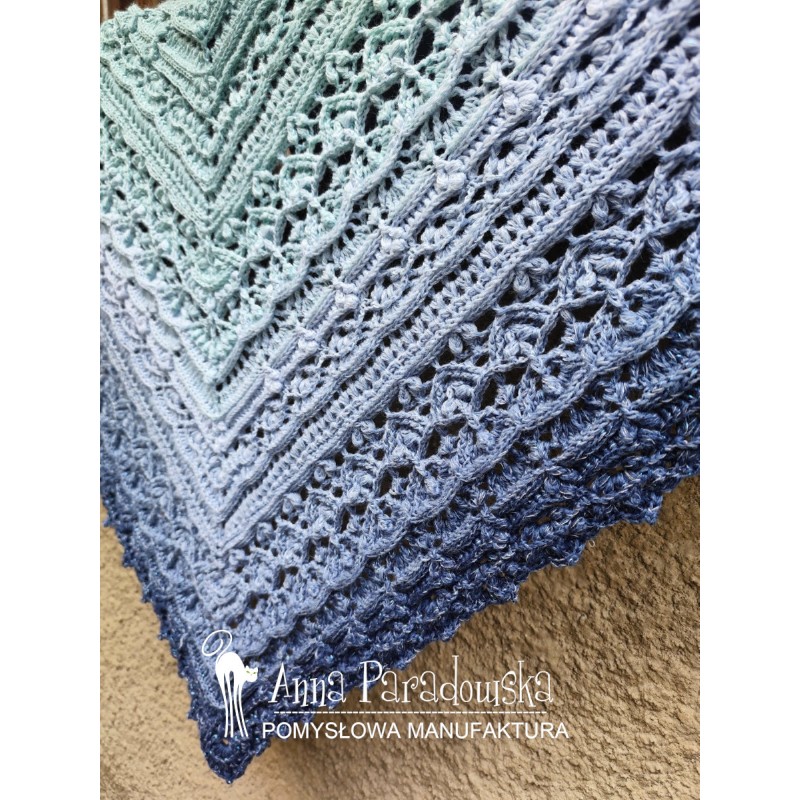 Chusta wykonana na szydełku wg wzoru FIRLETKA Pomysłowa Manufaktura. Piękna kolorystyka: indygo/denim/jeans/jasny niebieski/mięta/jasna patynaz dodtakiem delikatnej nitki opalizującej. Motek merino/akryl (50/50), bardzo mięciutka, przyjemna w dotyku. Wym. 200 x 90 cm. Do otulenia Twoich ramion lub jako oryginalny prezent. Potrzebujesz w innym kolorze? Napisz do mnie :)